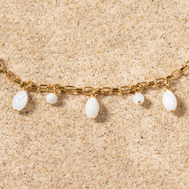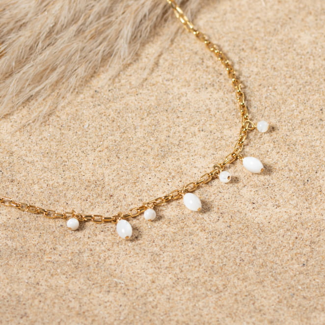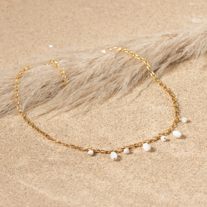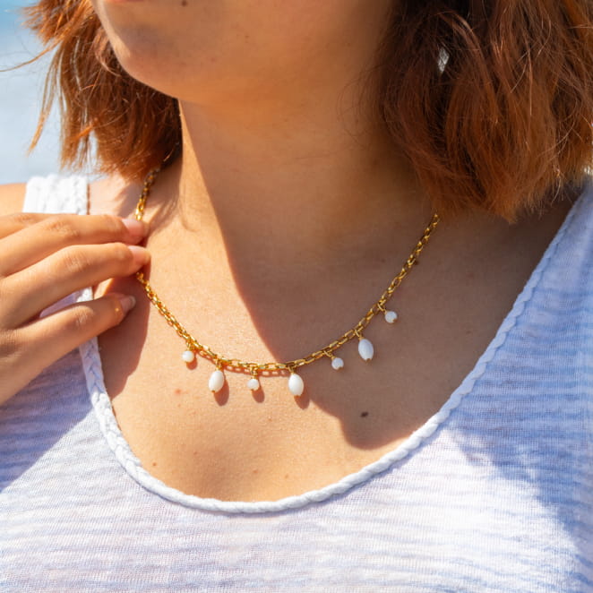 Le collier pour femme Milina enchante par sa délicatesse : une chaîne dorée raffinée ornée de pendentifs en perles nacrées blanches. voir plus