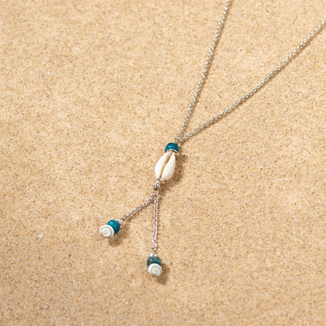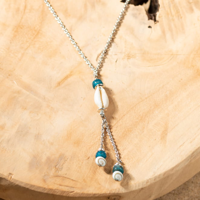 Embarquez pour un voyage au bord de l'eau avec le collier femme Mina. Véritable hommage à la mer et aux vacances, cette création se pare d'un coquillage cauri, d'un œil de Saint Lucie et d'une pierre bleue en apatite. Chaque élément raconte une histoire de plage et de moments précieux sous le soleil. Symbole de chance et de protection, l'œil de Saint Lucie évoque les trésors trouvés lors de balades sur la plage. Ce collier femme, fabriquée en France avec soin, apporte une touche de poésie à vos oreilles. Sentez la brise marine et laissez-vous emporter par leur charme élégant !
