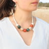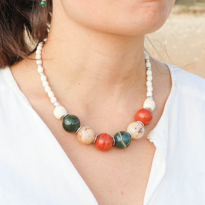 Laissez-vous séduire par le collier Mozza, un mélange de couleurs vives et de métal argenté. Ce collier apporte une touche de gaieté et de lumière à votre style. Les perles en jaspe rouge, agate vert, bois blanc et en howlite blanc rappellent les joyeux reflets des vacances au soleil.