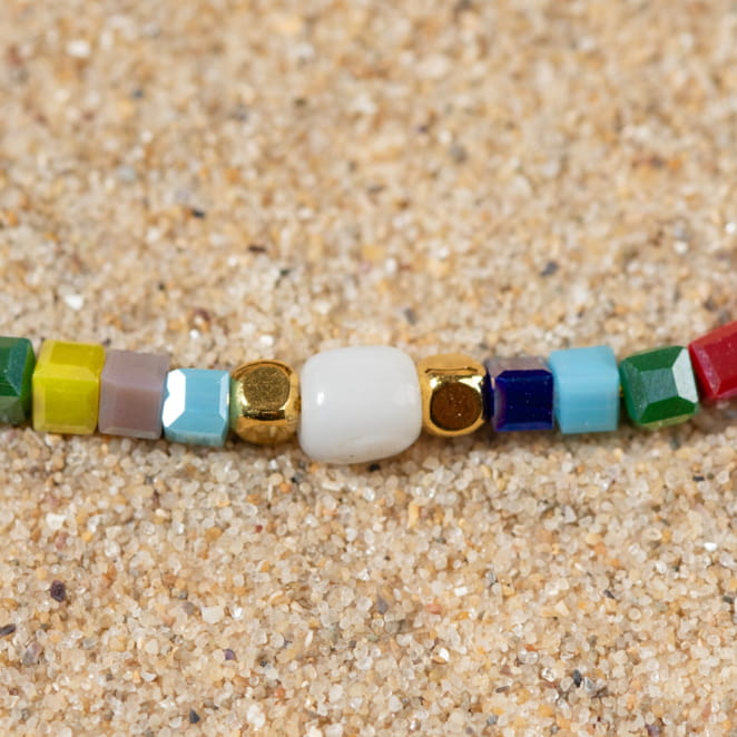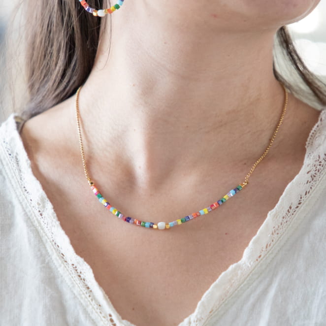 Optez pour le collier Murzo : un collier en chaîne dorée ornée de perles cubes en verre multicolore et d'une délicate perle en nacre blanche, qui apporte une touche de gaieté à n'importe quelle tenue. voir plus