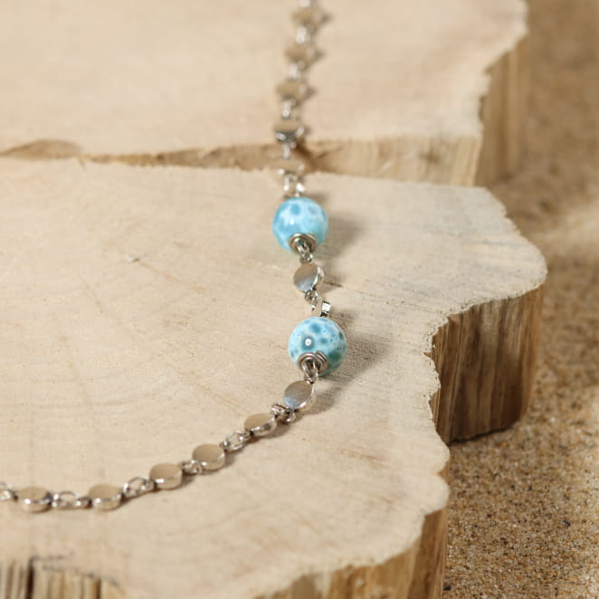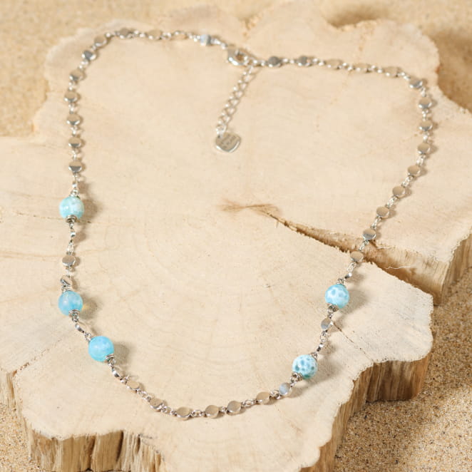 Évadez-vous vers des horizons lointains avec le collier Mya, une pièce unique qui capte la lumière et l’esprit des vacances. Inspiré par l’océan et le ciel bleu, ce collier femme vous apporte une sensation de fraîcheur et de liberté. Sa chaîne originale en métal plaqué argent 999, combinée aux perles en agate bleu ciel disposées de manière asymétrique, crée un bijou dynamique et lumineux. Ce collier, à la fois moderne et raffiné, est parfait pour ajouter une touche de légèreté et de sophistication à vos tenues quotidiennes.