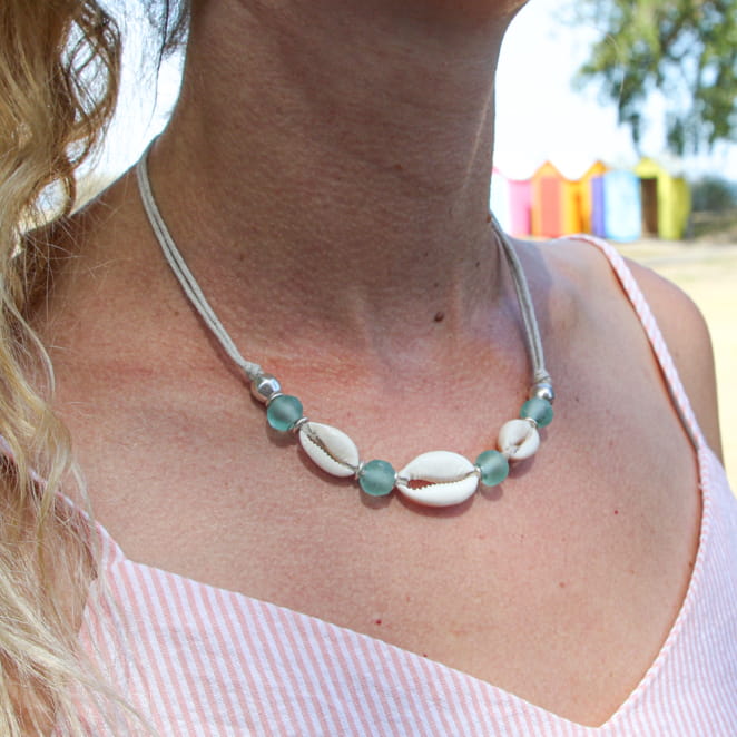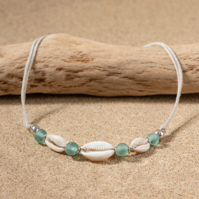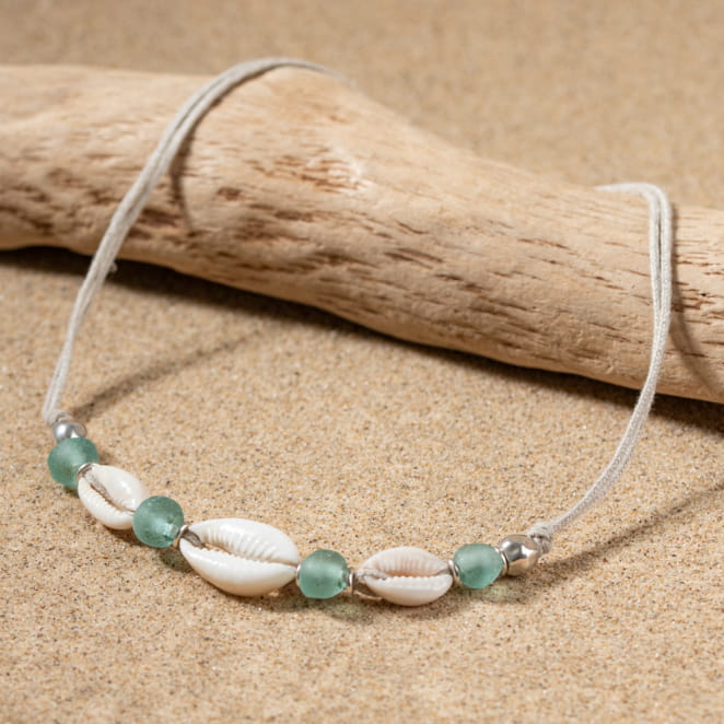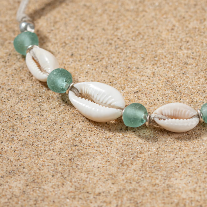 Ajoutez une touche naturelle à votre look avec le collier Nacula. Ce joli bijou en lin naturel, orné de petits coquillages cauri et de perles en verre recyclé vert d'eau, allie élégance éco-responsable et esprit bord de mer. Parfait pour les amoureux de la nature et de l'océan, il assure un style tendance et respectueux de l’environnement.
