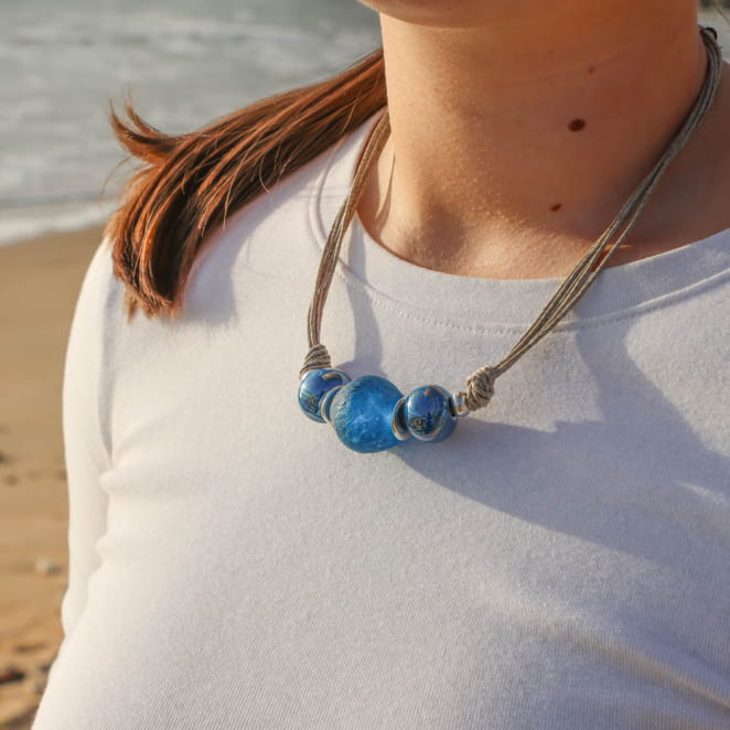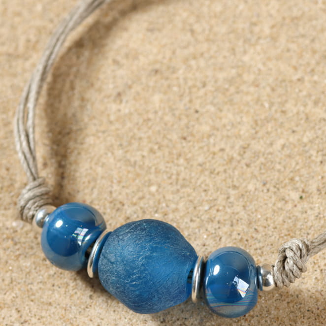- d'une perle en verre recyclé bleu,