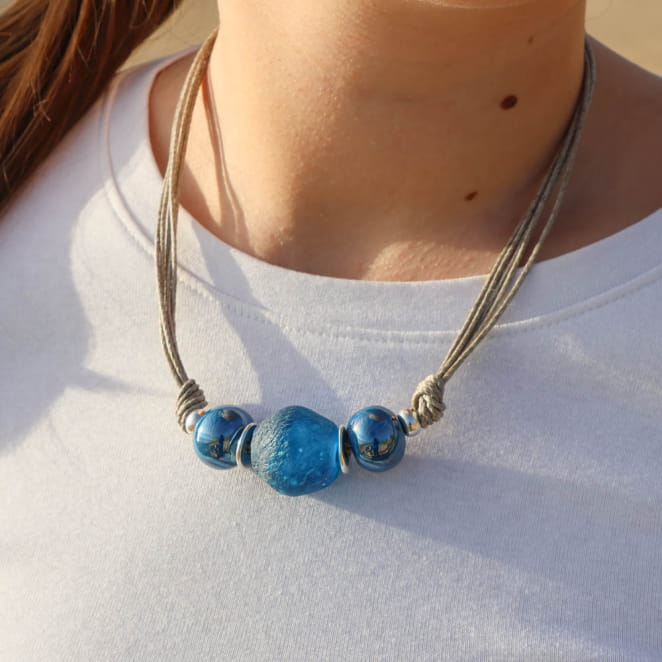 Laissez-vous séduire par l’authenticité du collier en lin Orotava, sublimé par des perles en céramique bleu pétrole et une perle centrale en verre recyclé. voir plus