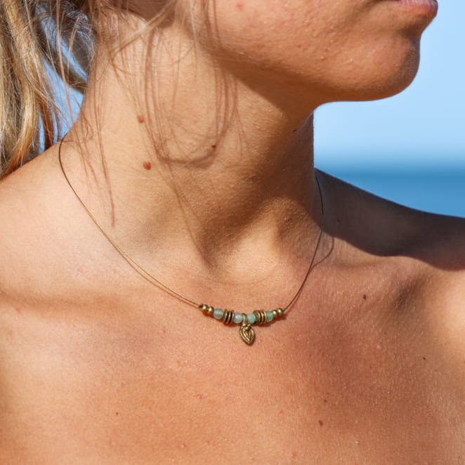 Découvrez le collier Patou, un bijou bronze aux détails vert d'eau, idéal pour un look raffiné et discret. voir plus