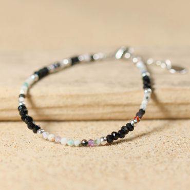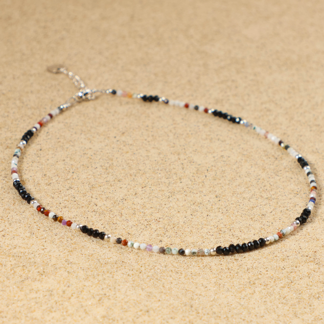Laissez-vous porter par l’élégance intemporelle de ce collier en perles pour femme Pertuis, où se mêlent la profondeur des perles de verre noir, l’éclat des perles en pierre multicolore, et la douceur des perles argentées. voir plus