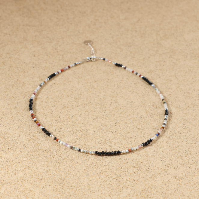 Laissez-vous porter par l’élégance intemporelle de ce collier en perles pour femme Pertuis, où se mêlent la profondeur des perles de verre noir, l’éclat des perles en pierre multicolore, et la douceur des perles argentées. Ce bijou apporte une touche d’authenticité artisanale. Parfait pour sublimer vos tenues ou offrir un cadeau unique, inspiré par les reflets changeants de l’océan.