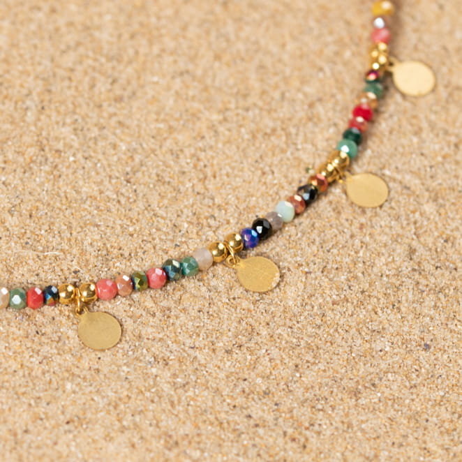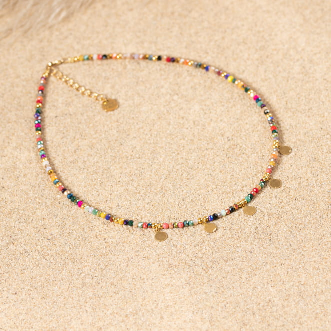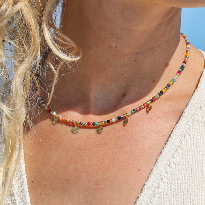 Sublimez votre style avec le collier Rakam ! Ce bijou fantaisie, délicatement orné de perles multicolores et de pendentifs dorés, ajoute une touche bohème chic à toutes vos tenues. Que ce soit pour une escapade décontractée ou une sortie élégante, ce collier léger et coloré deviend votre accessoire incontournable. Laissez-vous séduire par son charme irrésistible.