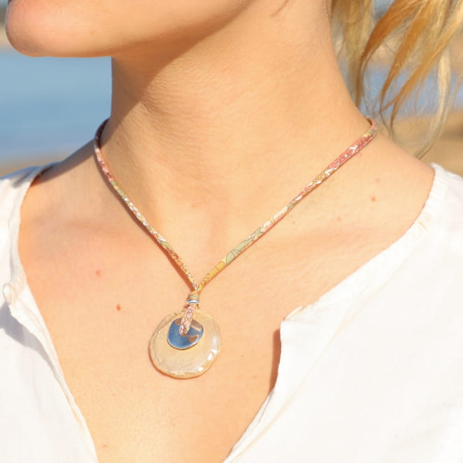 Retrouvez la douceur des vacances et l’authenticité du fait main avec le collier Roman. Ce bijou coloré, aux nuances beiges et argentées, allie céramique et tissu multicolore pour un style unique et lumineux. Parfait pour évoquer l’évasion et le charme du bord de mer, ce collier apporte une touche naturelle à chaque tenue.