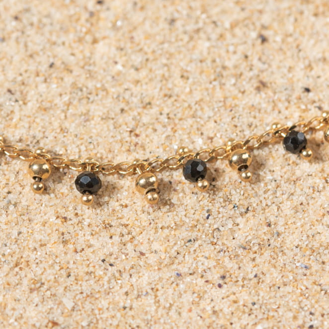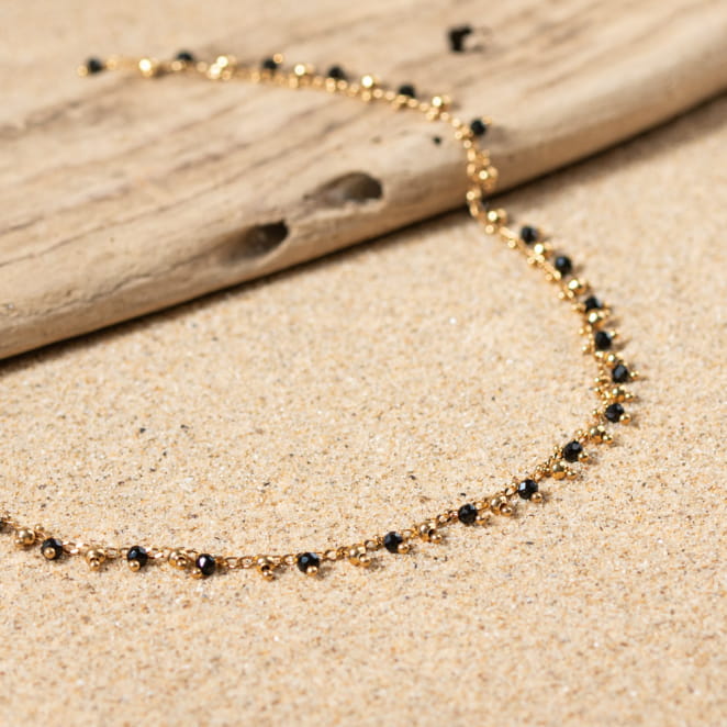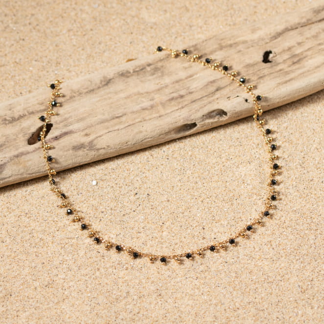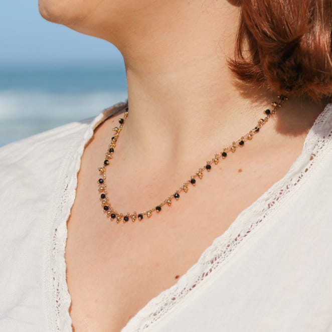 Ce délicat et élégant collier Ronde est un indispensable ! Ses perles noir accompagnées de sa chaine dorée mettent en valeur votre peau. La finesse de ce bijou le rend irrésistible et idéal à porter au quotidien.