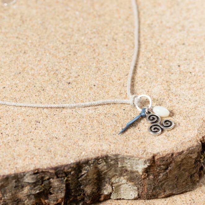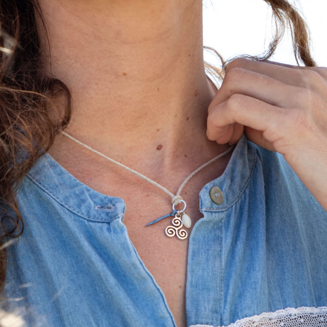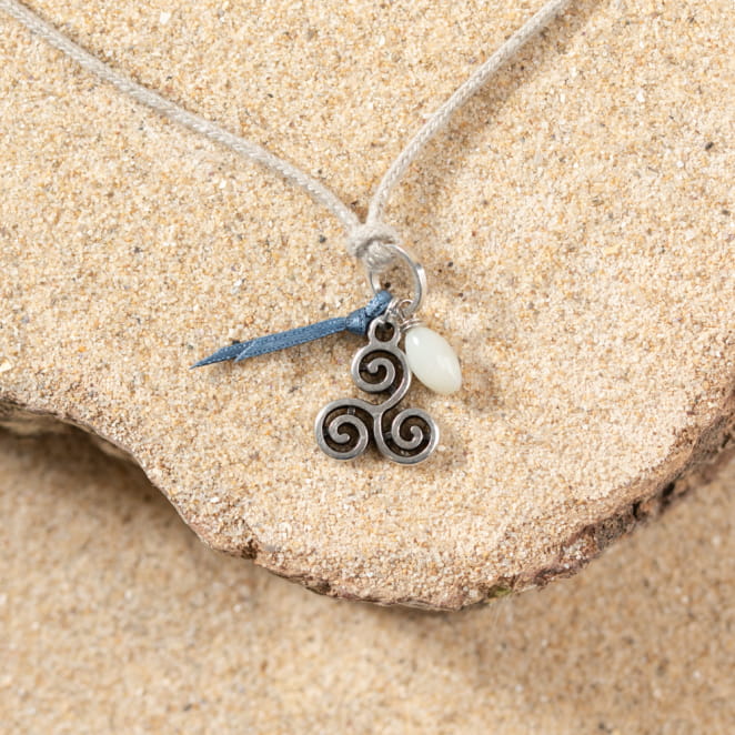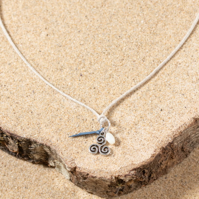 Le collier Rozen, confectionné en lin, incarne le charme de la Bretagne avec son triskel argenté : agrémenté d'une perle en nacre blanche et d'un ruban bleu, il évoque l'élégance délicate de la région. voir plus