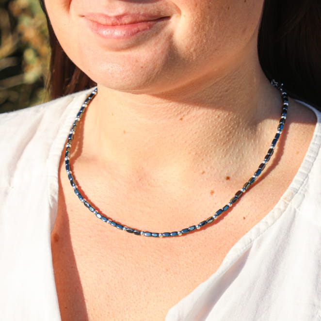 Craquez pour notre coliier en perles pour femme Seraphine aux perles argentées et hématite grises, rehaussé d’une chaînette de réglage pour un ajustement parfait. voir plus
