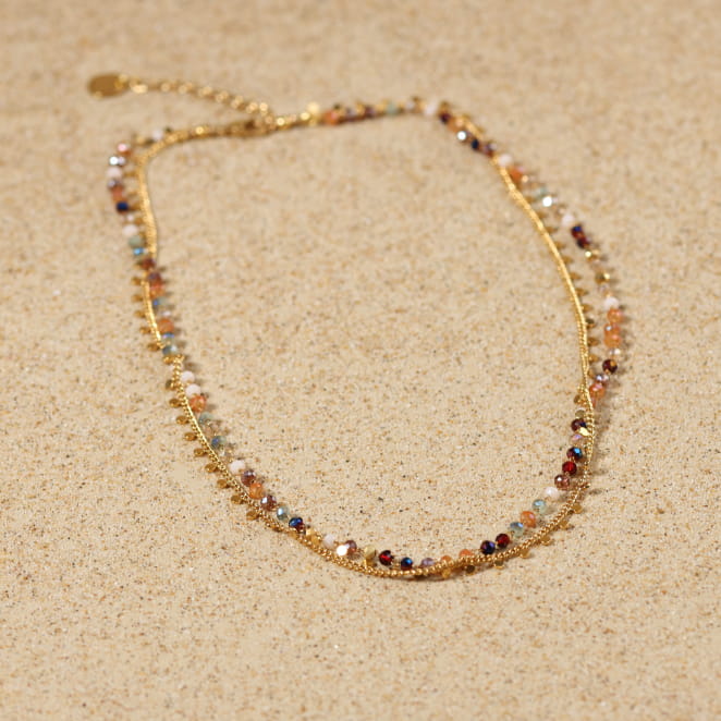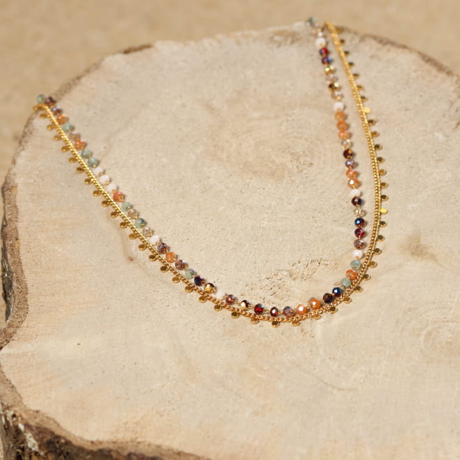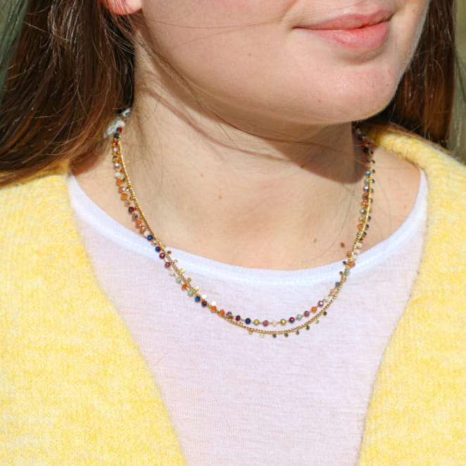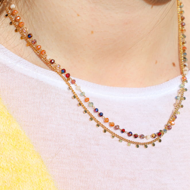 Appréciez au tour de votre cou le collier pour femme Solange, un bijou multicolore et doré qui apportera subtilement de l'éclat à votre tenue. Composé de chaînes, les petites perles en verre multicolores ajoutent couleur et harmonie élégante aux perles disques dorées. Un bijou pour femme chic et moderne qui s'associe à toutes vos tenues.