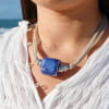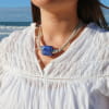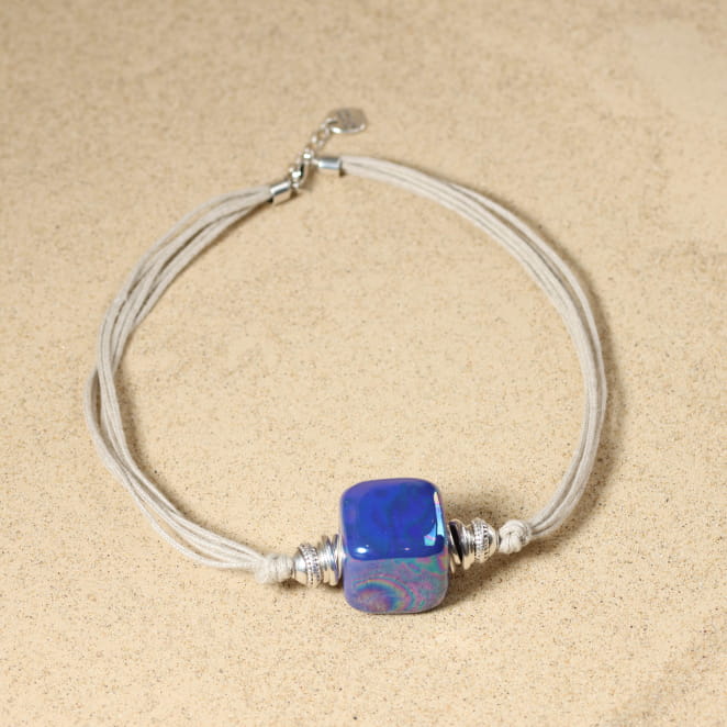 Découvrez le collier pour femme Thérèsa, un bijou artisanal où une perle en céramique bleu rappellent les nuances du ciel et de la mer tout en s'associant à des perles argentées et à des cordons de lin. voir plus