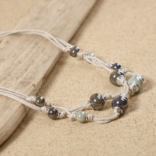 Le collier Tricha sublime votre cou en apportant une touche de fantaisie. Composé de perles céramiques aux nuances de kaki et d'un cordon en lin naturel de manière unique, il vous assure un look original et remarquable. Ce magnifique bijou coloré est parfait pour celles qui aiment se démarquer avec élégance.