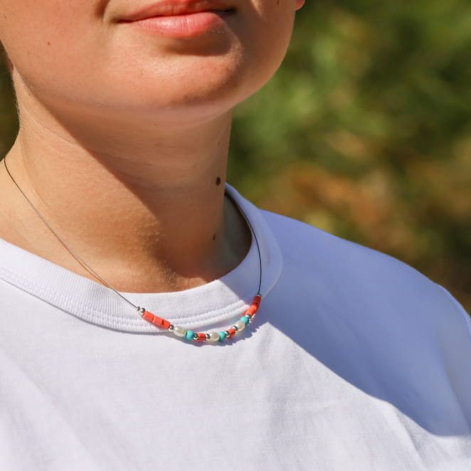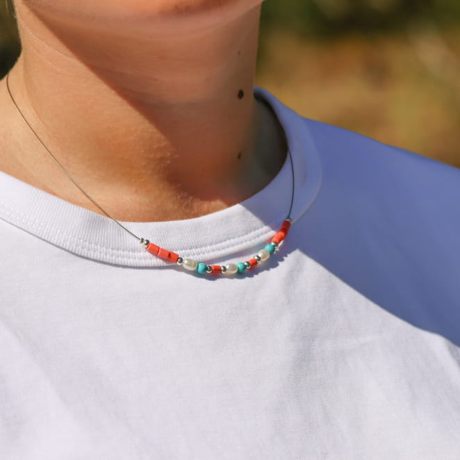 Laissez-vous séduire par le charme coloré du collier Tuamotu, une création joyeuse et raffinée inspirée des lagons du Pacifique et de la douceur estivale. Léger et discret, ce collier court met en valeur un délicat assortiment de perles aux teintes corail, turquoise et nacrées. Entre modernité et naturel, il évoque les plages de sable fin, les reflets de la mer et la beauté brute des matières.