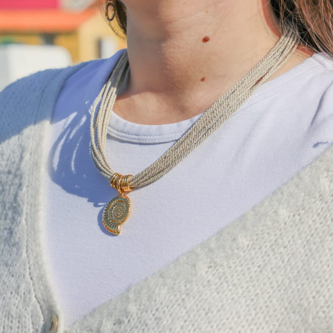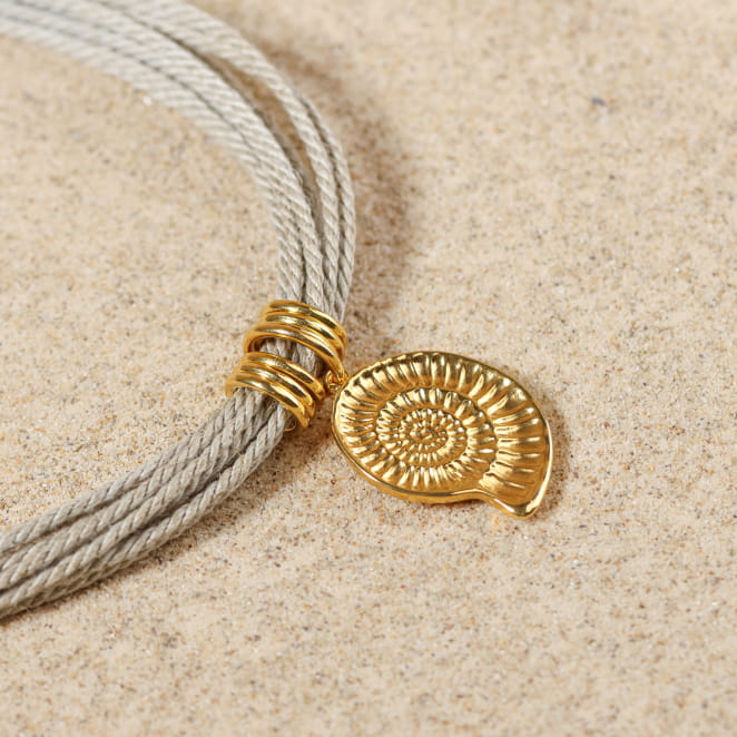 Plongez dans l’élégance naturelle avec le collier : Vague, doré aux multiples fils de lin beige. Son pendentif coquillage doré, délicatement suspendu, capte la lumière et sublime votre port de tête. De chaque côté, des anneaux ronds apportent une touche d’équilibre et de raffinement. Une pièce qui évoque les trésors du rivage et s’accorde à toutes vos tenues, du matin jusqu’au soir.