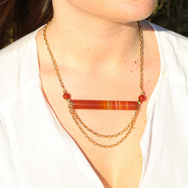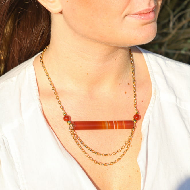 Apportez éclat avec le collier pour femme Venezia terracotta. Ces créations artisanales mêlent l’agate rouge créant des reflets chauds, à des perles et une chaîne dorées à l’or fin 24K. Leur style évocateur du naturel en font des accessoires uniques pour sublimer vos tenues avec une touche d’évasion. Parfait pour celles qui aiment les bijoux lumineux, ce bijou apporte une harmonie avec ces délicats matériaux.