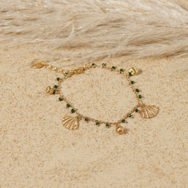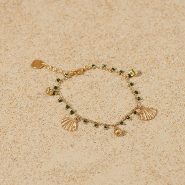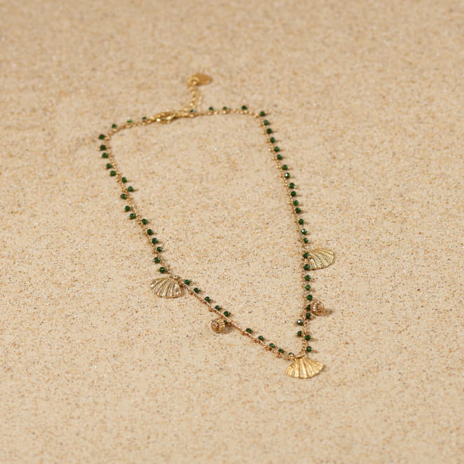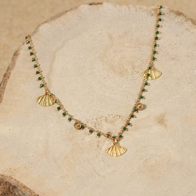 Profitez du soleil jusqu’au bout du cou. Le collier, Verseau, est une invitation se balader sur le sable. Sa chaîne légère, ponctuée de petits grelots verts et de perles dorées, danse autour du buste avec délicatesse. Deux pendentifs coquillage dorés ajoutent une touche marine raffinée, tandis que la médaille Retour de Plage vient signer ce bijou en toute simplicité. À porter en vacances ou dès les premiers beaux jours, ce bijou devient un incontournable. Lumineux, joyeux et facile à assortir, il accompagne aussi bien vos tenues de saison estivale comme hivernale.