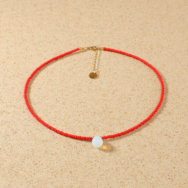 Découvrez le collier Volta, une pièce lumineuse et intemporelle qui apporte une touche d’éclat à vos tenues. Ce collier pour femme, aux perles de verre rouge et aux détails dorés à l’or fin 24K, évoque la douceur des couchers de soleil sur l’Île d’Oléron. Son pendentif en forme de goutte en verre blanc rappellent l’artisanat soigné et l’esprit nature de nos créations. Ce bijou artisanal saura sublimer vos moments d’évasion, entre bord de mer et sérénité.