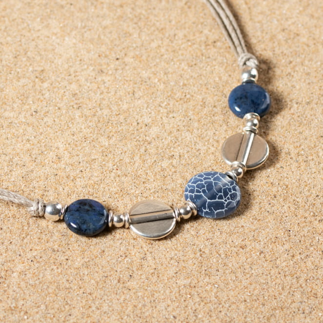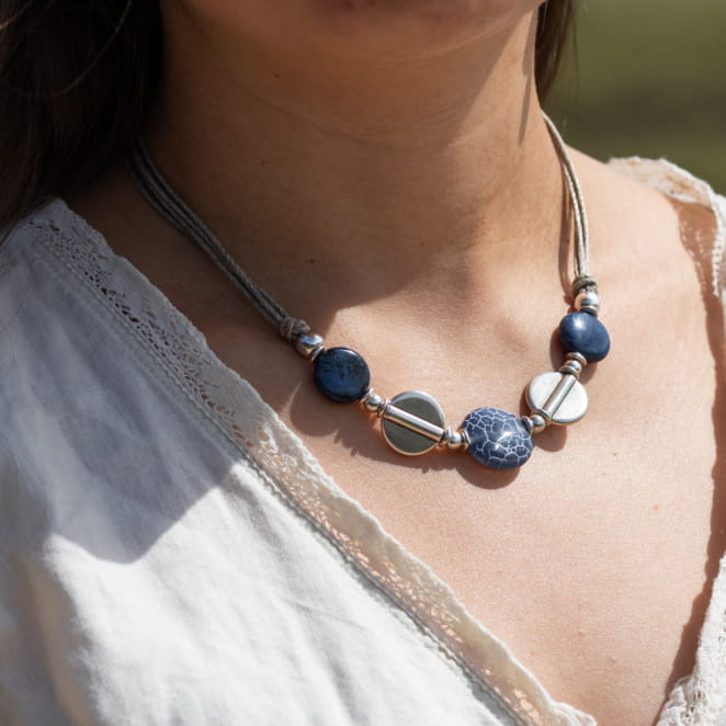 Découvrez le collier pour femme Yoga, un bijou élégant et raffiné. Conçu en lin beige, il est orné de perles bleu marine et argenté, apportant une touche sophistiquée à votre tenue. Ce collier incarne l'équilibre parfait entre naturel et élégance, idéal pour sublimer votre style avec une note de sérénité et de charme.