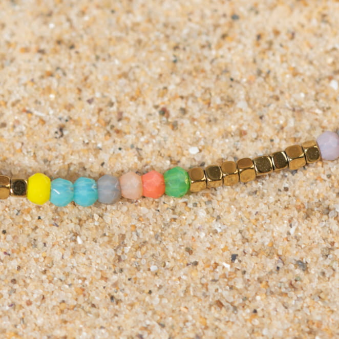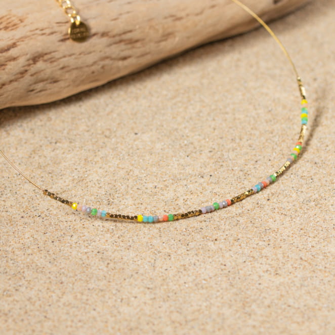 Découvrez le collier Zazie, une élégance subtile incarnée. Ce bijou raffiné se compose de perles en hématite dorées, façonnées en cubes, et de perles en verre multicolores qui créent une harmonie parfaite de couleurs et de lumière. Sa conception délicate et moderne ajoute une touche sophistiquée à votre décolleté. Pour un look complet, associez-le aux boucles d'oreilles et au bracelet Zazie, formant une parure chic et coordonnée qui illumine chaque occasion.