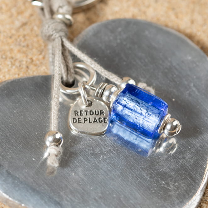 Découvrez le porte-clés Adriatique, une élégance marine à emporter partout avec vous. Il se compose d'un pendentif cœur argenté, de cordons en lin beige et d'une jolie perle en verre bleu transparent, rappelant la pureté de la mer. Parfait pour ajouter une touche de raffinement et de fraîcheur à vos clés !