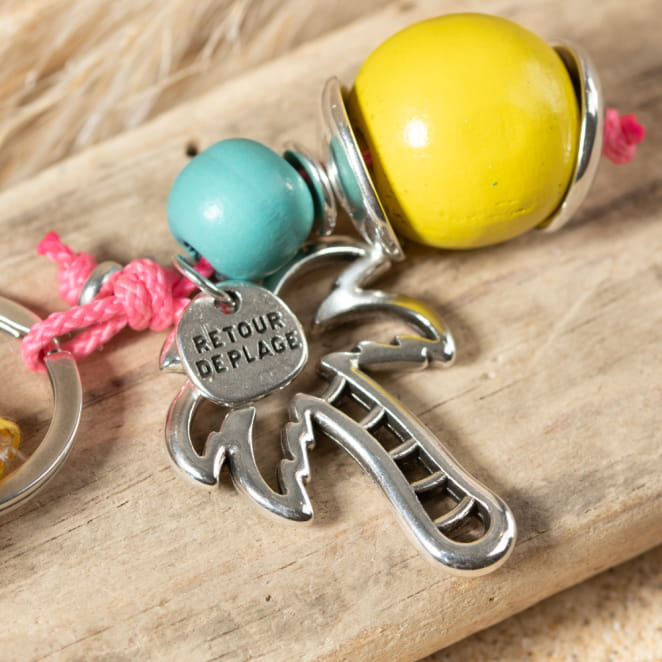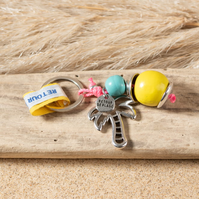 Découvrez le porte-clefs Beverly : un accessoire multicolore en jaune, bleu et rose, évoquant les couleurs vives des vacances. voir plus