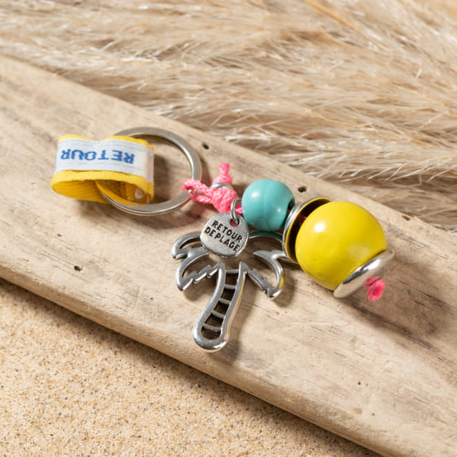 Découvrez le porte-clefs Beverly : un accessoire multicolore en jaune, bleu et rose, évoquant les couleurs vives des vacances. Son pendentif en forme de palmier argenté ajoute une touche d'exotisme et de fun. Idéal pour égayer vos clés, ce porte-clefs est parfait pour ceux qui souhaitent emporter un peu de soleil partout avec eux.
