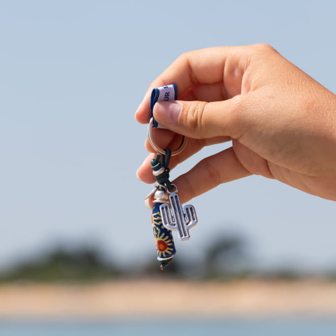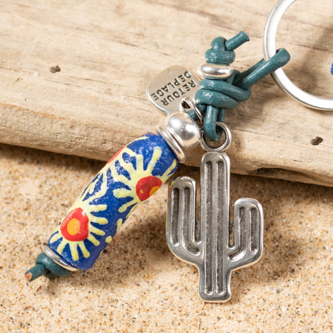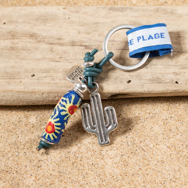 Ajoutez une touche d'exotisme à vos clés avec ce porte-clés cactus. Composé d'un élégant cordon en cuir bleu, il est orné d'une perle bleu à motifs soleil et d'un pendentif cactus argenté. Pratique et stylé, ce porte-clés apportera une touche unique et originale à votre quotidien.
