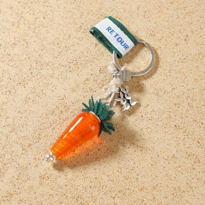 Découvrez le porte-clés Carotte, une création pleine de gaité pour égayer votre quotidien. Ce porte-clés, aux couleurs vives et naturelles orné d'une perle en verre orange, façonnée en carotte. Son pompon vert en tissu rappellent les teintes lumineuses de la nature, tandis que le petit lapin apporte une touche de poésie. Un accessoire fait main, idéal pour celles et ceux qui aiment allier utilité et fantaisie, dans un esprit artisanal et ensoleillé.