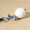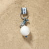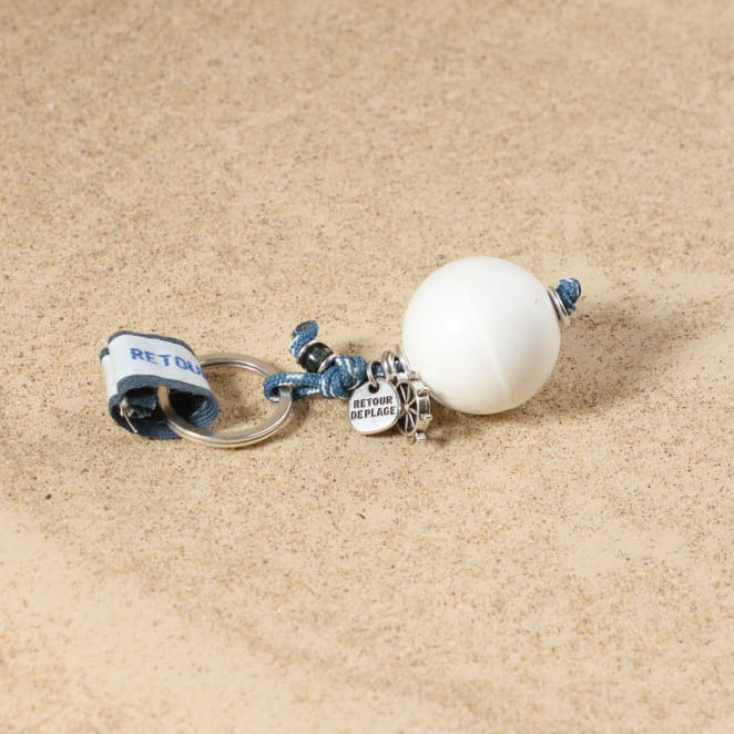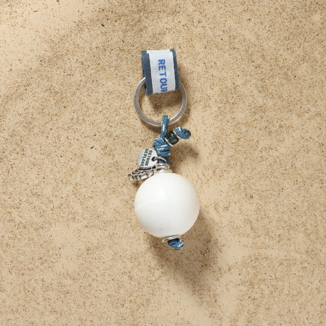 Emportez avec vous une touche de la côte Ouest grâce à ce porte-clés artisanal Charente, alliant un cordon en nylon bleu rappelant les flots et un pendentif argenté en forme de roue, symbole de mouvement et d’aventure. La perle de verre bleue et la boule en polyester blanc ajoutent une note de légèreté.