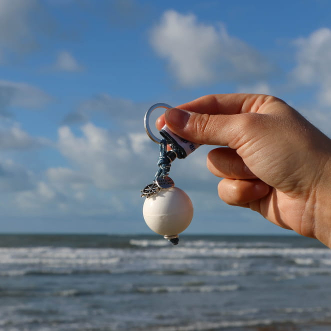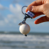 Emportez avec vous une touche de la côte Ouest grâce à ce porte-clés artisanal Charente, alliant un cordon en nylon bleu rappelant les flots et un pendentif argenté en forme de roue, symbole de mouvement et d’aventure. La perle de verre bleue et la boule en polyester blanc ajoutent une note de légèreté.