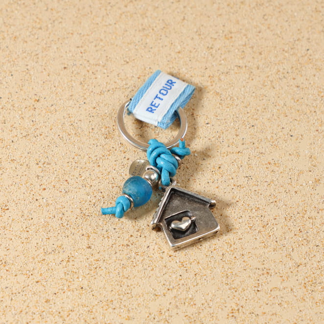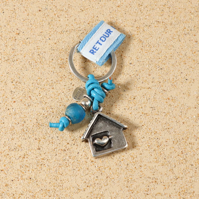 Couette est le porte-clefs parfait pour accompagner votre clé de maison. Un accessoire mignon qui vous permettra de ne pas perdre vos clés mais aussi de les accompagner joliment d'un pendentif en forme de maison du bonheur argenté accompagné d'un cordon en cuir bleu et d'une perle en verre recyclé bleue.