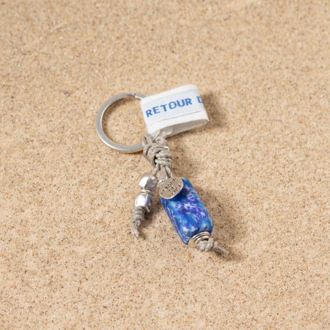 Optez pour l'originalité avec le porte-clés Damia : son design met en avant une pièce tube en verre recyclé aux tons bleu multicolore, accompagné d'un cordon en lin naturel et de perles cubes en métal argenté. Pratique et élégant, il devient votre allié indispensable pour ne plus égarer vos clés, tout en ajoutant une touche de style à votre quotidien.