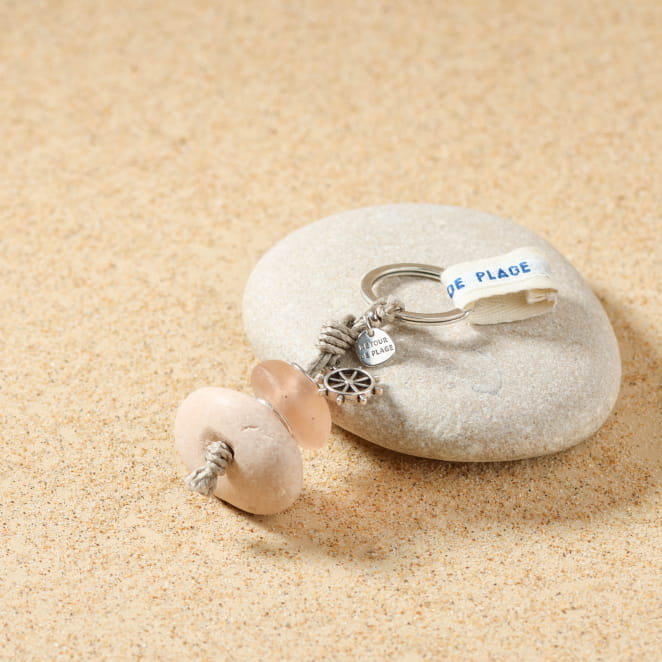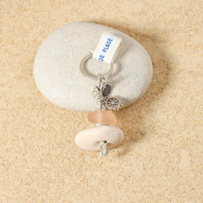Retrouvez l’esprit des falaises d’Etretat avec ce porte-clés artisanal Etretat, où le bleu du ciel et de la mer se marie à l’éclat de l’argent. Ce porte-clés allie élégance et authenticité avec sa perle en verre recyclée bleue et son galet en pierre blanche. Cet accessoire rappel les vacances et l’évasion, tandis que le pendentif en forme de roue ajoute une touche de charme intemporel.