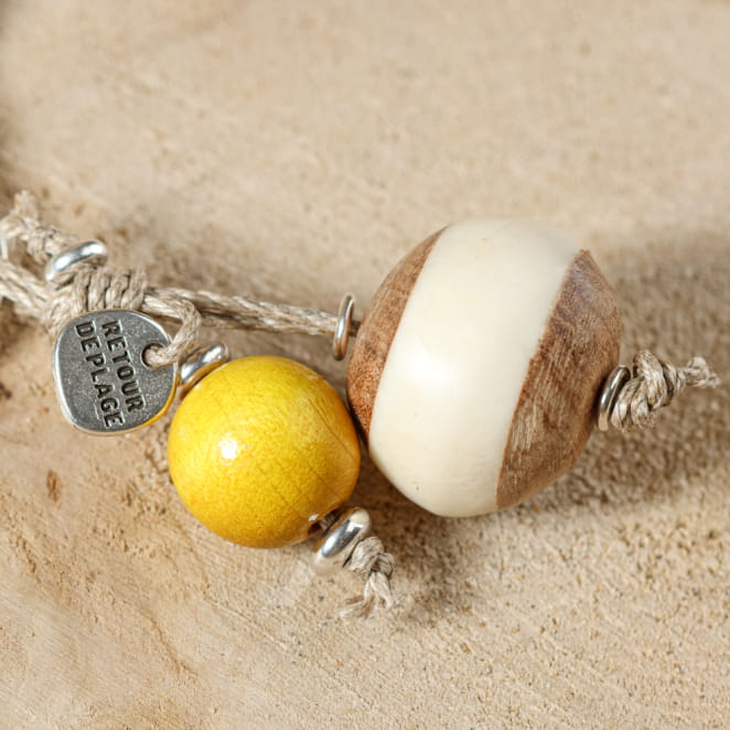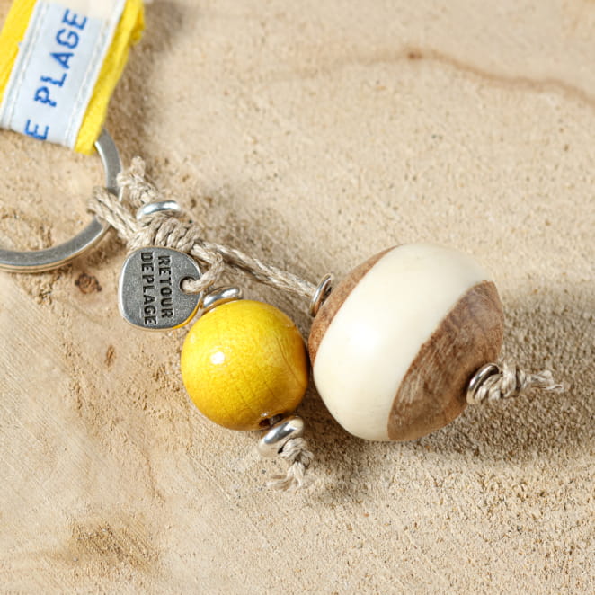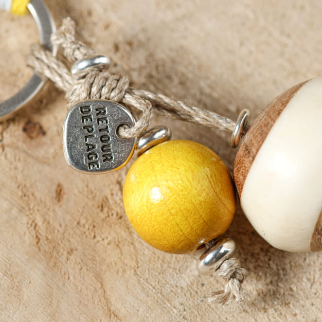 Évoquez les doux instants d'été avec le porte-clés Figeri, une création unique alliant une perle en os bicolore blanche et marron et une vibrante perle en bois jaune. voir plus