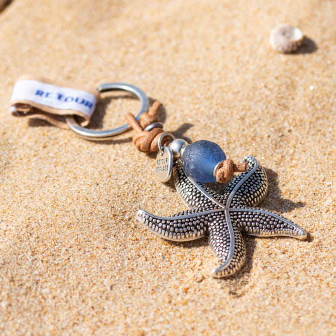 Découvrez notre adorable porte-clés Hacelia, l'accessoire parfait pour ajouter une touche marine à votre quotidien ! Fabriqué avec un cordon en cuir marron et orné d'une perle bleu montana étincelante, ce porte-clés étoile de mer est à la fois élégant et durable.
