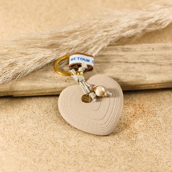 Retrouvez notre porte-clefs Lalie en matière recyclée ! Son pendentif en forme de coeur beige en polymère biosourcé est suspendu à un cordon de lin beige et agrémenté de petites perles en céramique beige et marron. Parfait, pour vous rappeler vos balades en bord de mer. Ce porte-clefs fait main, allie les jolies matières naturelles et des teintes sobres.