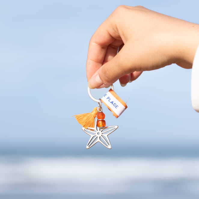 Découvrez le porte-clés Manta : un bijou élégant composé d'un pendentif étoile argenté, d'un pompon et de perles en verre orange. Parfait pour personnaliser vos clés ou sacs, il allie style et raffinement avec une touche maritime. Un accessoire indispensable pour égayer votre quotidien avec chic et originalité.