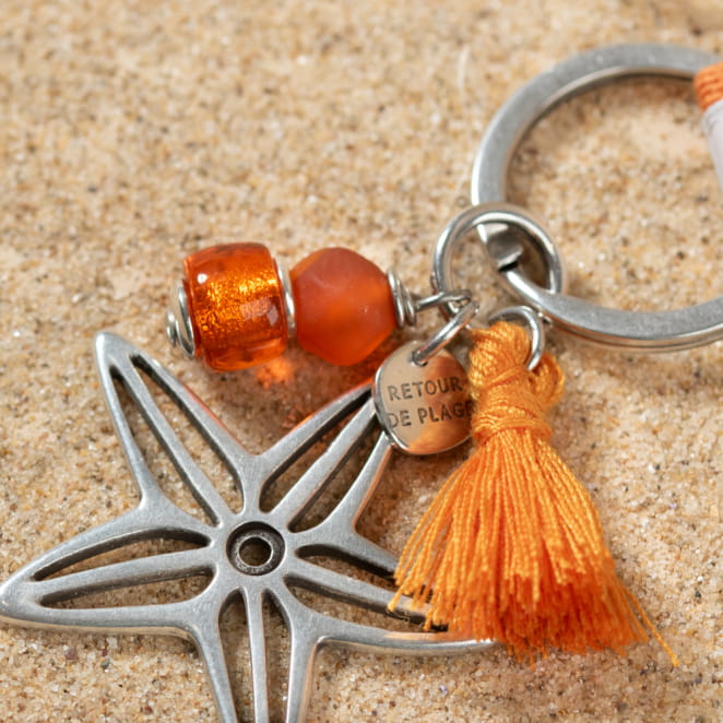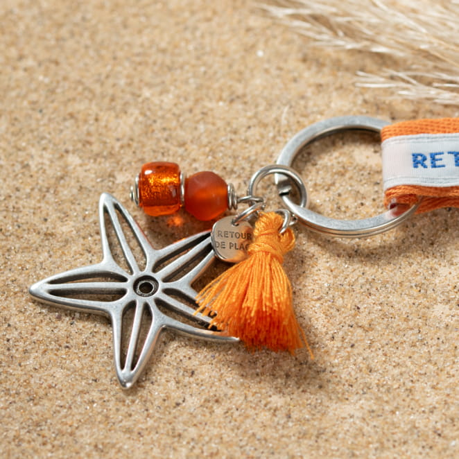 Découvrez le porte-clés Manta : un bijou élégant composé d'un pendentif étoile argenté, d'un pompon et de perles en verre orange. voir plus