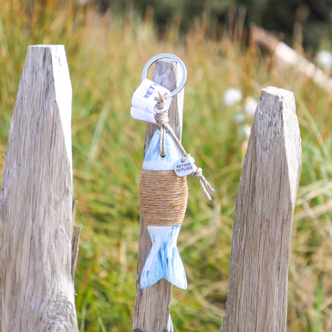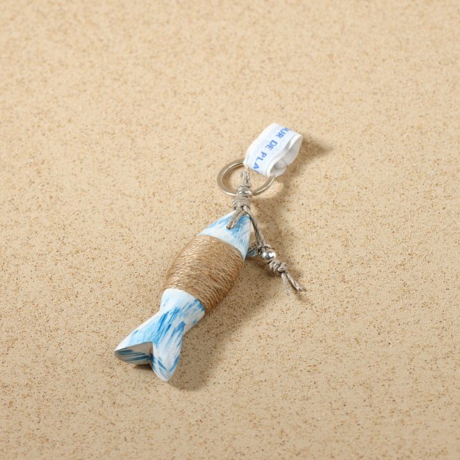 Adoptez un petit bout de bord de mer à emporter partout, avec le porte-clefs, Merlu. Ce porte-clés en bois blanc et bleu, sculpté en forme de poisson, évoque les promenades au port et le calme des vacances en bord de mer. Autour de son centre, un cordon de lin est délicatement enroulé, ajoutant une touche naturelle et artisanale qui rappelle les filets de pêche et les matières du bor de mer. Sa texture douce et son design épuré en font un objet à la fois décoratif et pratique.