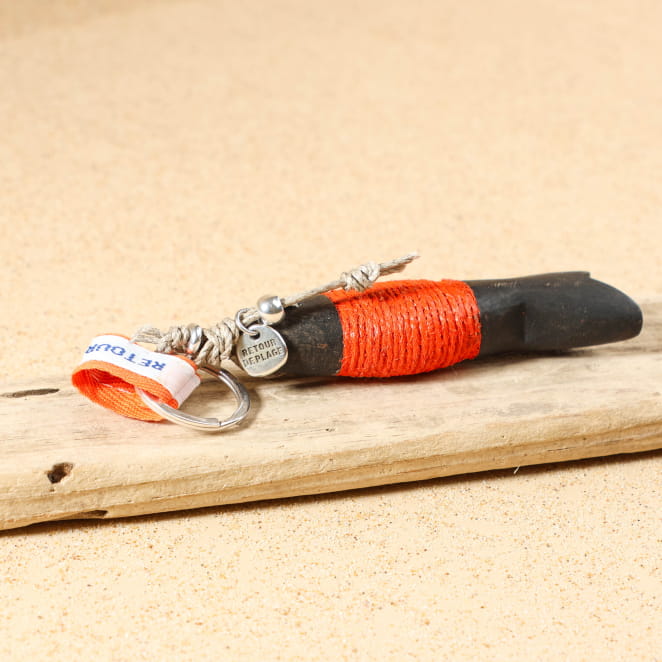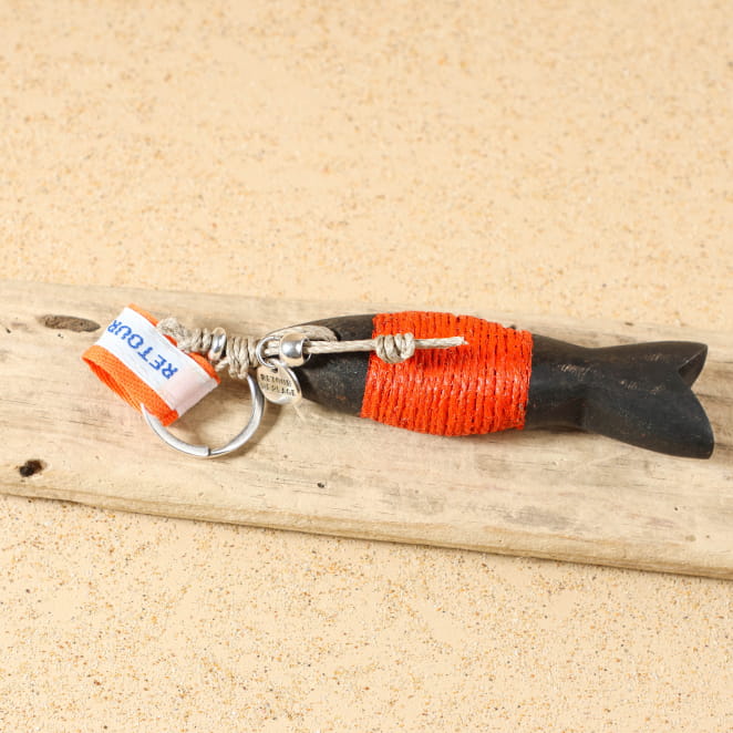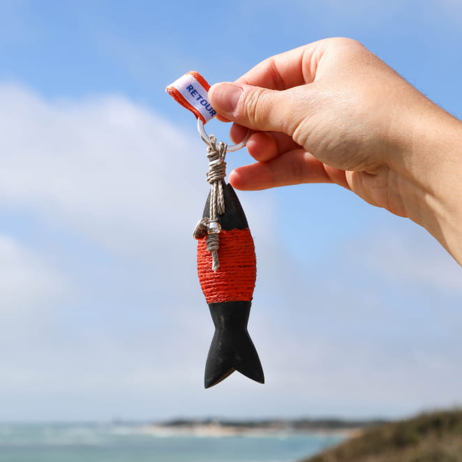 Adoptez un petit bout de bord de mer à emporter partout, avec le porte-clefs, Merlu. Ce porte-clés en bois foncé, sculpté en forme de poisson, évoque les promenades au port et le calme des vacances en bord de mer. Autour de son centre, un fil de coton rouge, est délicatement enroulé, ajoutant une touche naturelle et artisanale qui rappelle les filets de pêche et les matières brutes. Sa texture douce et son design épuré en font un objet à la fois décoratif et pratique.
