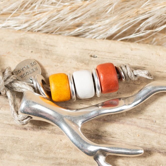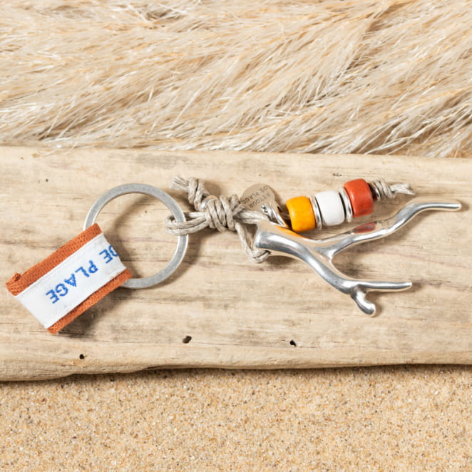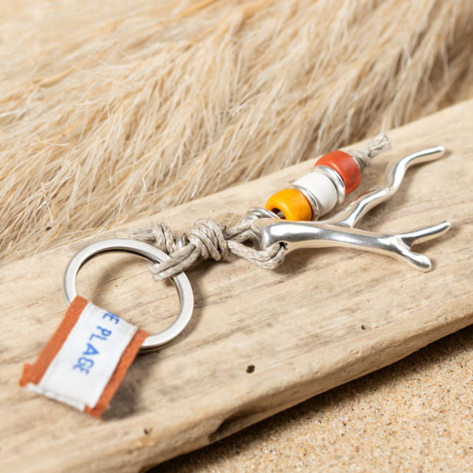 Découvrez l'élégance marine avec le porte-clés Moggi : arborant un pendentif corail en métal argenté, accentué par un cordon en lin beige et des perles multicolores, ce porte-clés évoque la beauté des fonds marins. voir plus