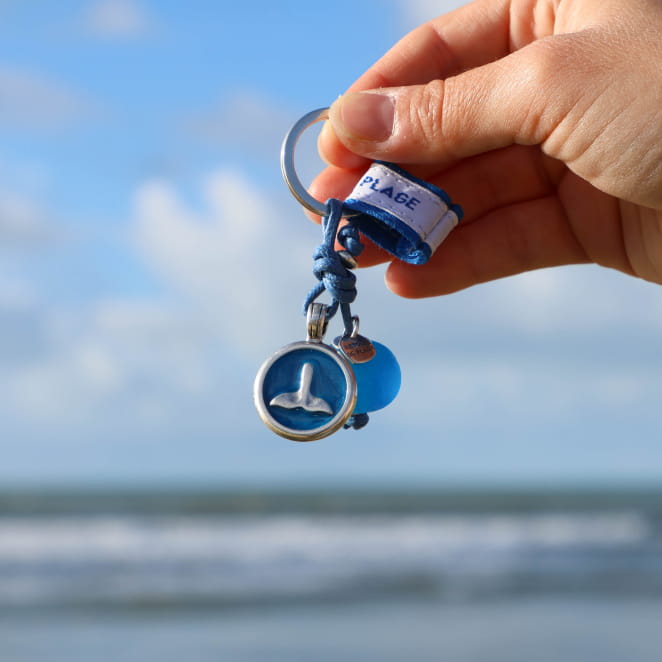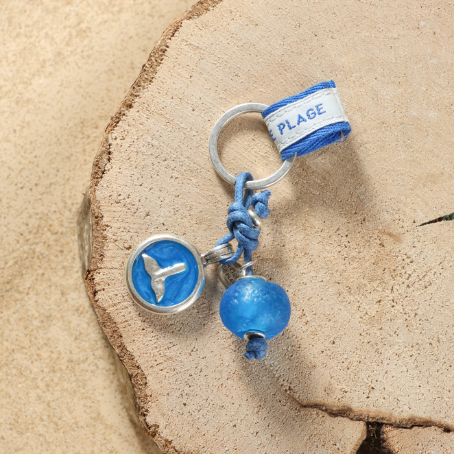Optez pour notre porte-clés Samana : sa perle en verre recyclé bleu se marient au pendentif rond émaillé représentant une queue de baleine. Parfait pour vous rappeller de vos souvenirs de vacances au bord de l'océan !