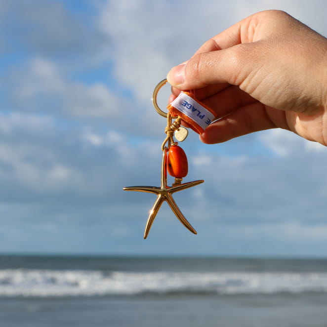 Laissez-vous apportez de la couleur avec le porte-clés Symi, où l’éclat doré d’une étoile de mer en métal doré, rencontre la douceur d’une perle en corail bambou orange. voir plus