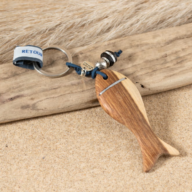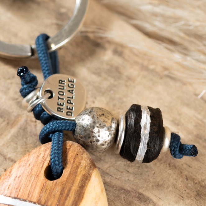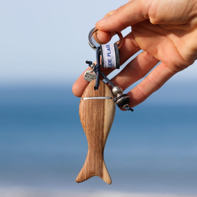 Le porte-clefs Vandoise allie nature et élégance avec son design en bois en forme de poisson. Accompagné d'un cordon bleu en polyester recyclé et de perles en métal argenté, cet accessoire original apporte une touche authentique à vos clés. Parfait pour les amateurs d'esprit bord de mer, le porte-clés Vandoise est un choix idéal !