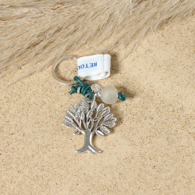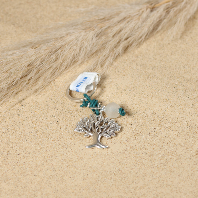 Ajoutez une touche de sérénité à votre quotidien avec notre porte-clés Vie. Un symbole d'équilibre, cet arbre de vie en métal argenté est orné d'une perle en verre grise, rehaussé par un cordon de cuir vert. Un accessoire chic et significatif pour accompagner vos clés.