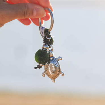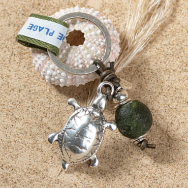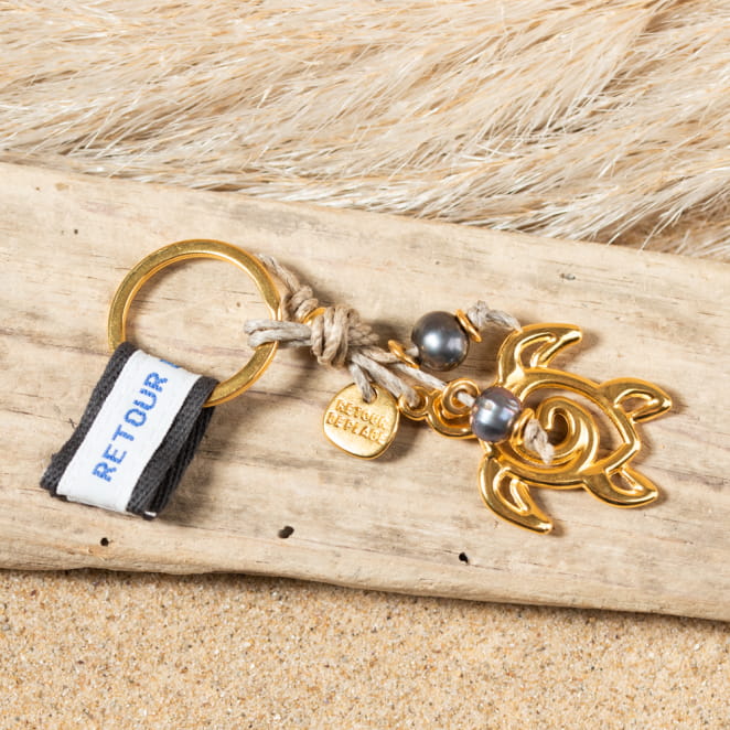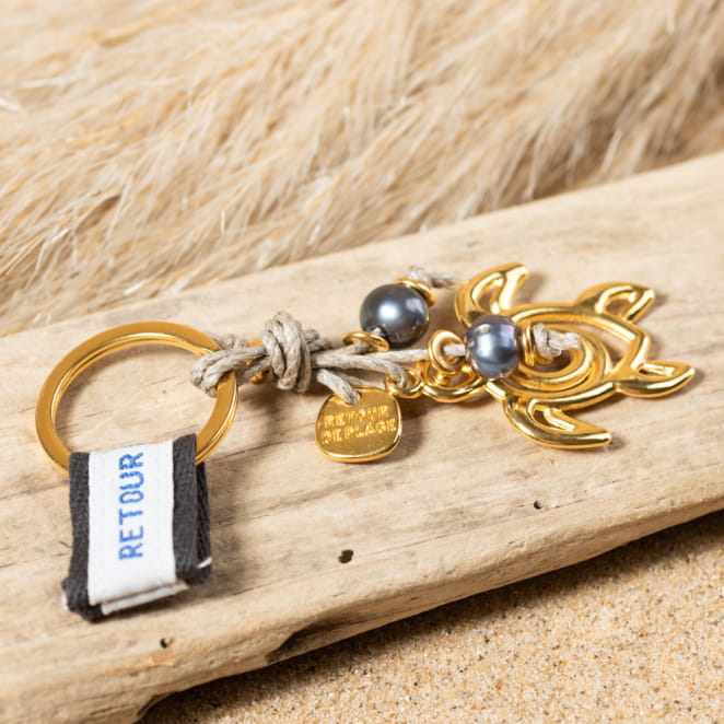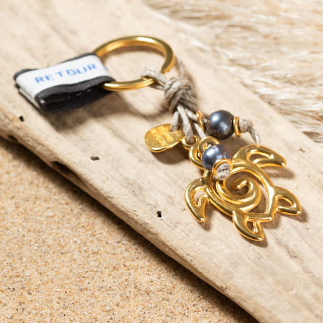 Plongez dans l'univers marin avec le porte-clés Yaffa : doté d'un pendentif tortue doré, d'un cordon en lin beige et de perles de rivière gris anthracite, cet accessoire évoque la tranquillité de la mer. voir plus