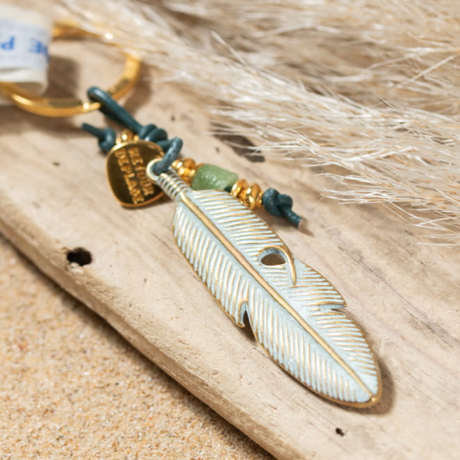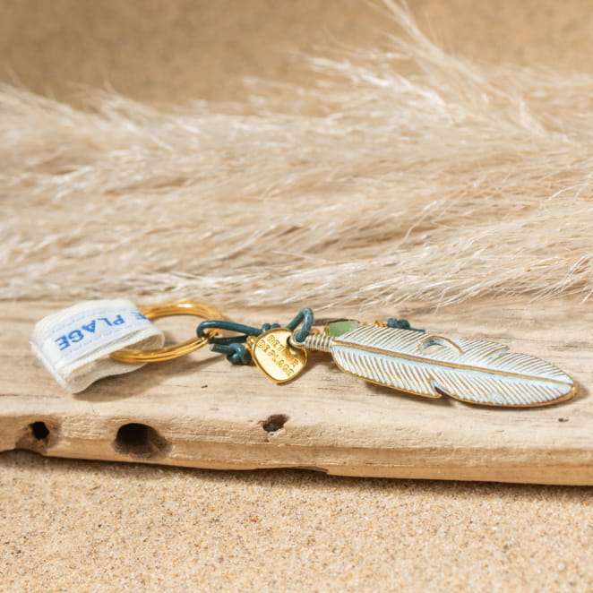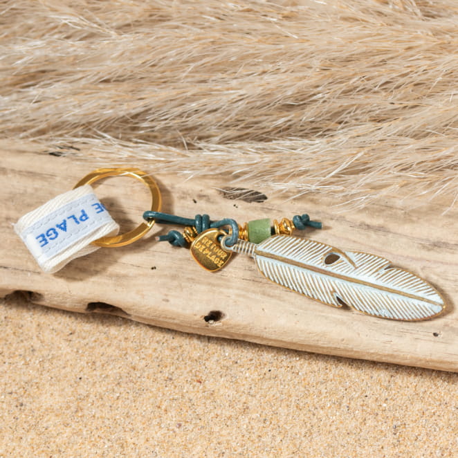 Découvrez l'élégance discrète avec le porte-clefs Yara. Ornée d'une plume dorée et d'une perle en verre, cette pièce sublime est rehaussée par un cordon en cuir vert bouteille. Un accessoire chic et pratique pour agrémenter vos clés ou sacs de cette touche sophistiquée.